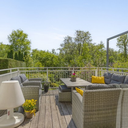 Omdat de woonkamer grenst aan een lager gelegen tuin, bereik je via een paar treden je zonnige oase op het zuiden. Deze tuin, omgeven door groen, biedt volop ruimte om de kinderen veilig te laten spelen of te ontspannen met vrienden tijdens een gezellige barbecue.